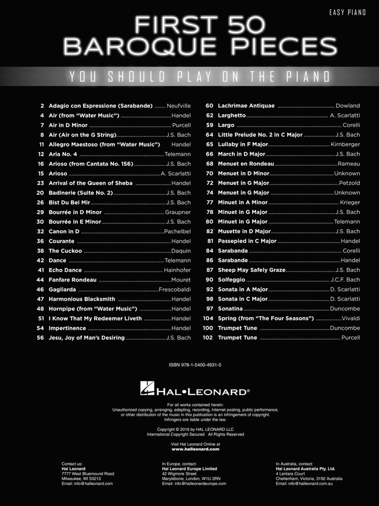 This collection features 50 Baroque pieces that all pianists should know. Each arrangement is simple and streamlined, yet still captures the essence of the music.